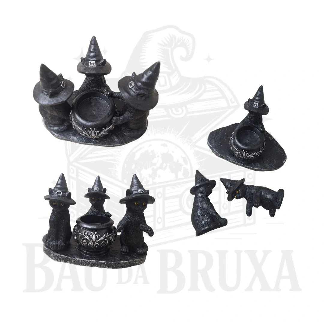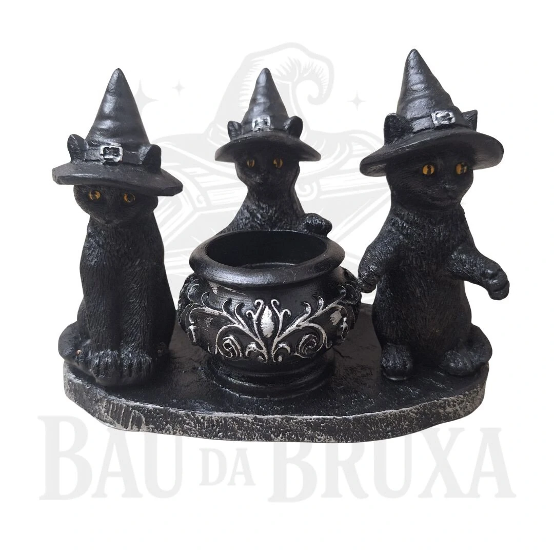 Trio de Gatos Bruxos com Caldeirão - Incensário e Porta Vela