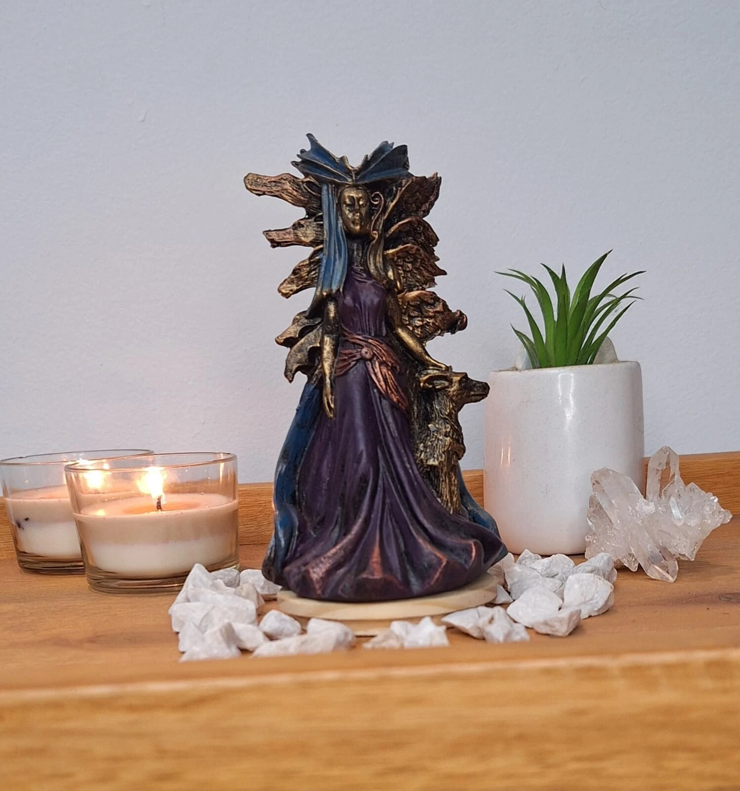 Esta peça é ideal para ser colocada em prateleiras, mesas ou em seu altar pessoal. Celebre o poder e a sabedoria de Hecate com esta bela estatueta. Ideal para presentear alguém especial ou para adicionar à sua própria coleção de itens místicos.