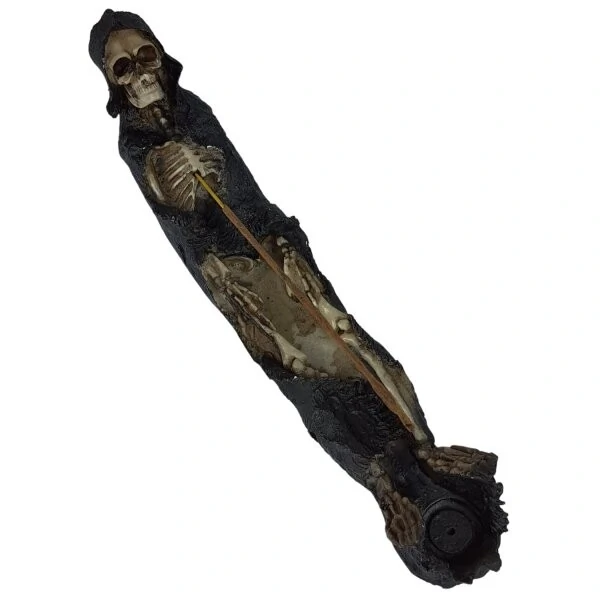 Este incensário apresenta um design exclusivo em formato de caveira, ideal para quem busca um toque de estilo e personalidade na decoração. é perfeito para utilizar com incensos de varetas, proporcionando um ambiente relaxante e perfumado.