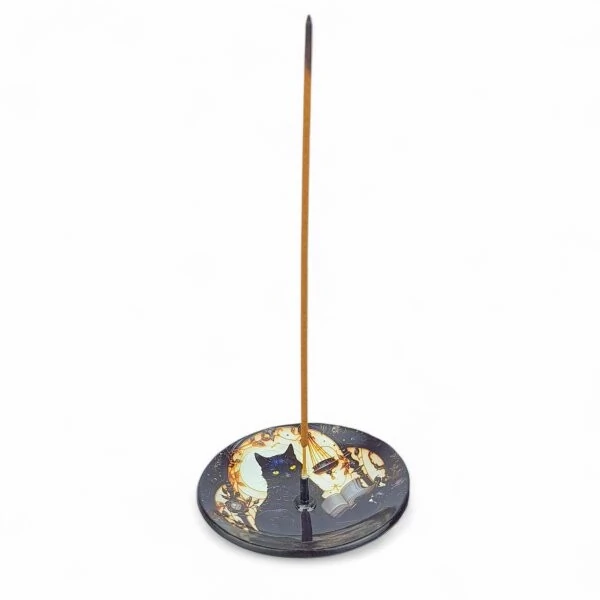 Com um design charmoso em formato de pratinho, ele possui um lindo detalhe de gato preto que o torna um objeto de decoração encantador. Ideal para uso diário, ajuda a criar um espaço sereno para relaxamento e meditação.