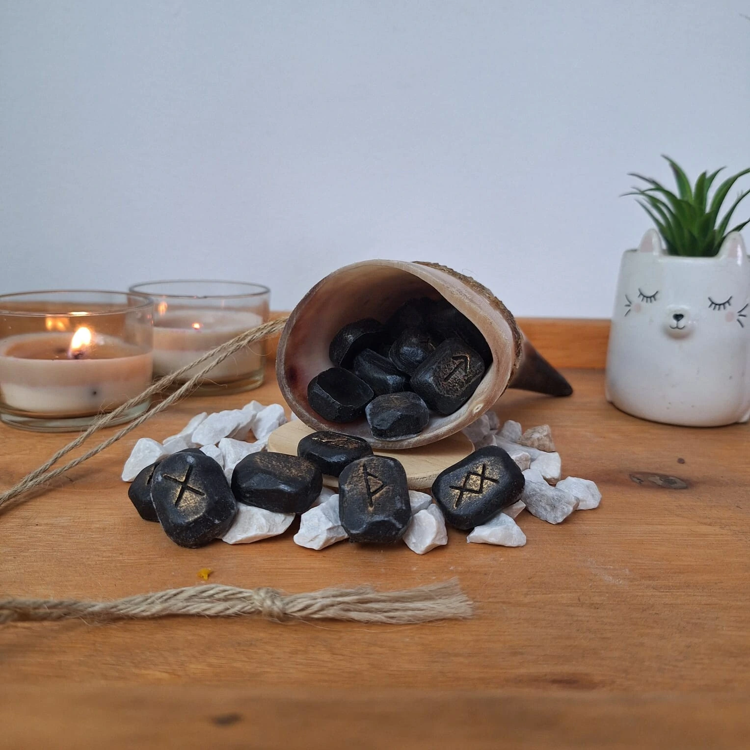 Ideal para entusiastas da cultura nórdica, este conjunto inclui um chifre para a tiragem ao modo viking, que complementa perfeitamente as runas. Perfeito para decoração, meditação ou como um presente especial para alguém que aprecia a história e o misticismo Viking.